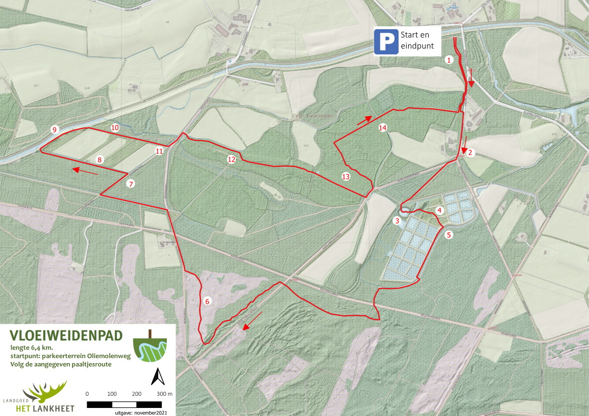 Het vloeiweidenpad is uitgezet om het landschap waar eeuwenlang hooilanden zijn bevloeid, ervaarbaar te maken. Je loopt in en langs het beekdal van de Buurserbeek. Naast historisch landschap, het beekdal en de hogergelegen heideterreinen, zijn ook hedendaagse landschapselementen zoals de waterzuiverende rietfilters in de route opgenomen. De nummers op de kaart corrensponderen met de teksten hieronder. Veel wandelplezier!