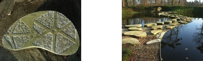 Tussen de vijvers die in elkaar overlopen, is een wandelpad met stapstenen aangelegd, met daarop geometrische figuren die de kristallen symboliseren, die de zuivering in ons lichaam mogelijk maken, ‘mediëren’. De ontwerpen daarvan zijn van de Engelse beeldend kunstenares Emma Varley. De wandeling over de stenen tussen de twee vijvers, waarlangs het water stroomt, spiegelt ons het leven zélf. Het amphi-theater maakt het mogelijk daar in stilte, vorm en voordracht bij stil te staan. Buchanan citeert hier Confucius: “In a water level, the water is in a most perfect state of repose. Let that be your model. The water remains quietly within, and does not overflow. It is from the cultivation of such harmony that virtue results”. Klik hier voor een direct commentaar van Jim Buchanan op de KidneyPools, direct na de uiteindelijke realisatie, zomer 2007.